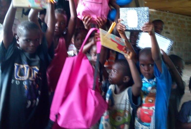 The children of Krukai Town have gathered to recieve their regular supplies of teaching and learning materials from our team.